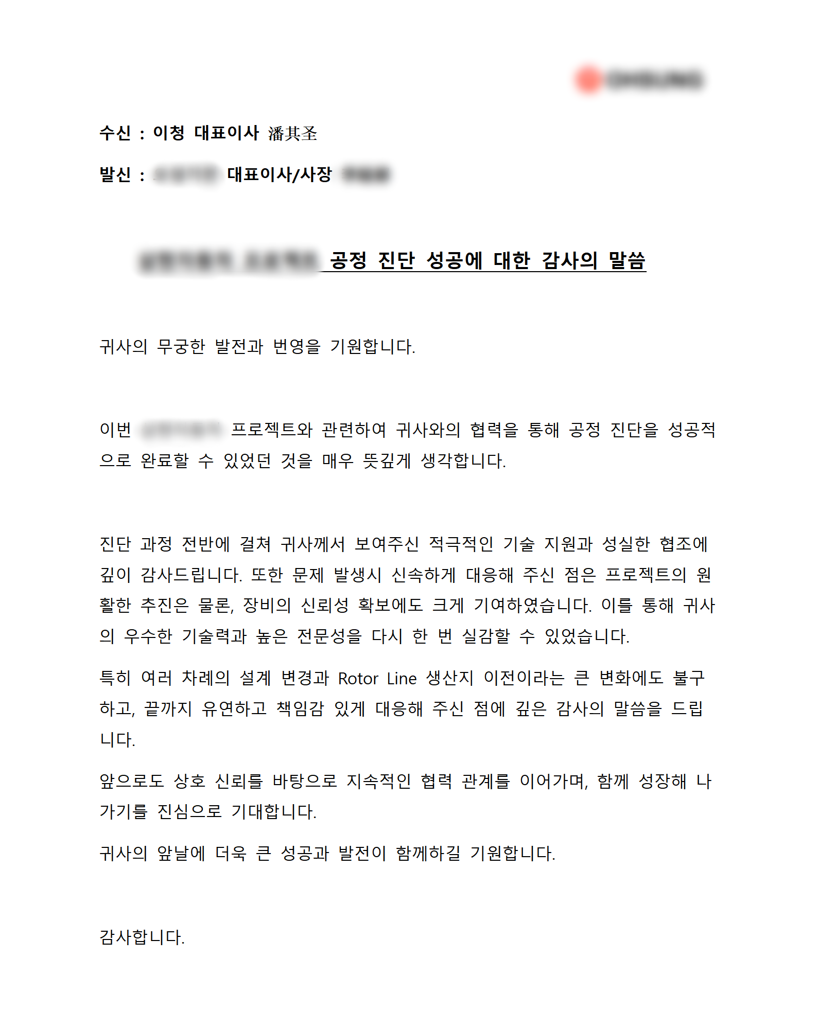 近日,益誠公司為某韓國知名客戶量身打造的汽車馬達(dá)自動化生產(chǎn)線項目取得重要階段性成果,順利完成核心階段的全面工藝診斷工作。在該項目執(zhí)行期間,益誠團隊?wèi){借高度定制化的解決方案、卓越的專業(yè)能力與出色的項目表現(xiàn),贏得了客戶的高度認(rèn)可,喜獲該客戶方發(fā)出的官方書面感謝信。